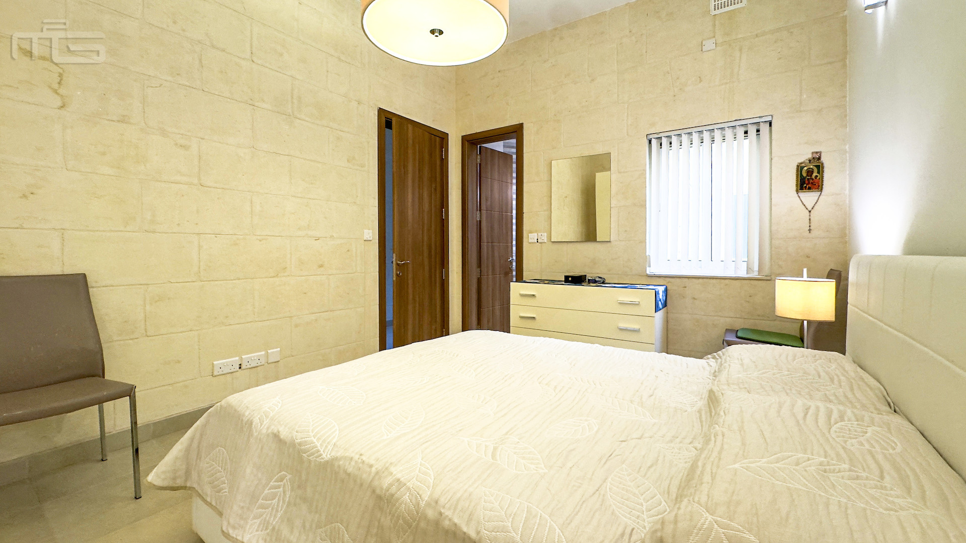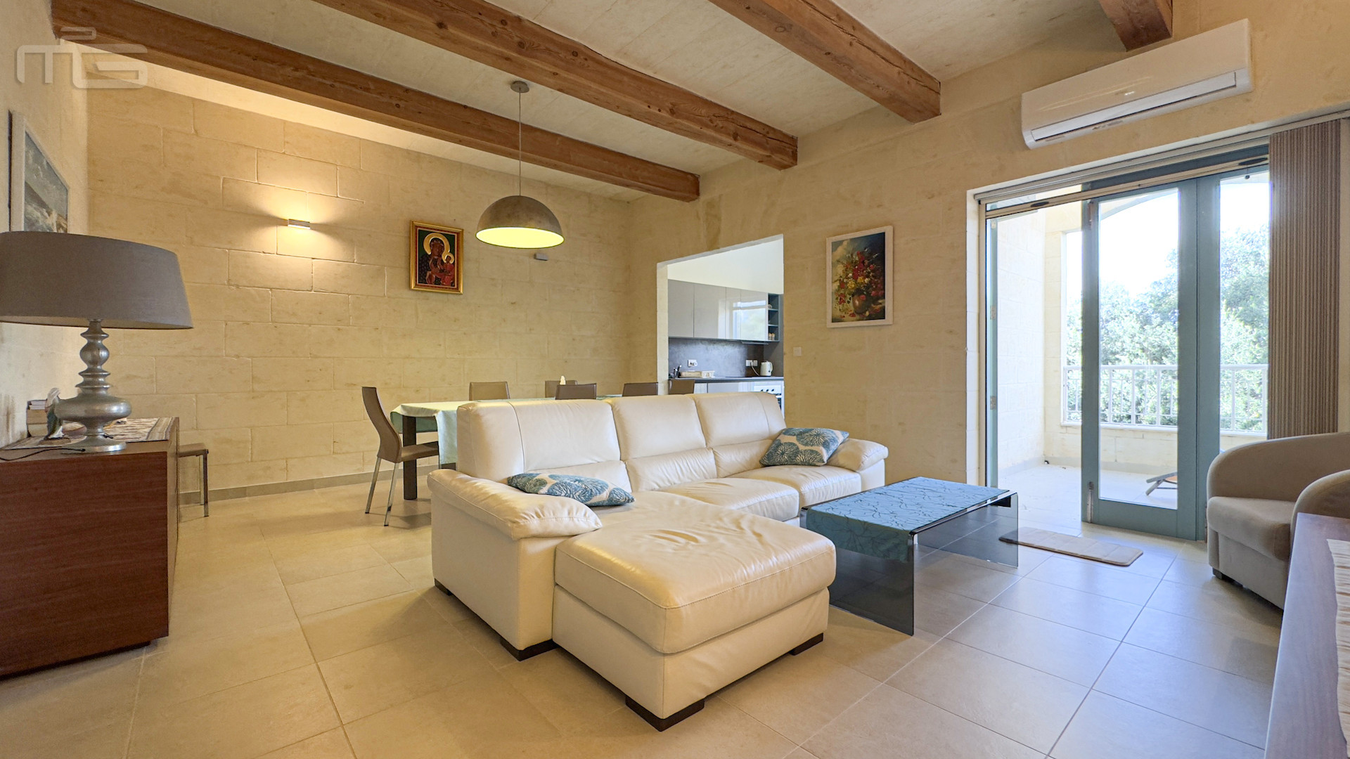 The main living space is generous and thoughtfully designed. The living and dining areas form an open-plan layout, creating an inviting atmosphere ideal for relaxing or entertaining. The kitchen sits just off the dining area, connected by a wide opening that gives it a semi-separate feel while still flowing naturally with the rest of the space. From here, the apartment enjoys beautiful views over the communal pool, the lush surrounding countryside, and up towards the village of Żebbuġ, with partial side views extending towards the sea.