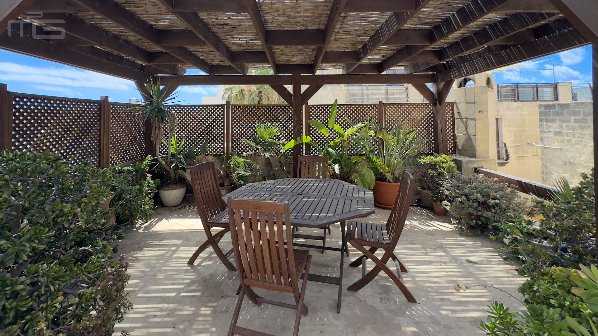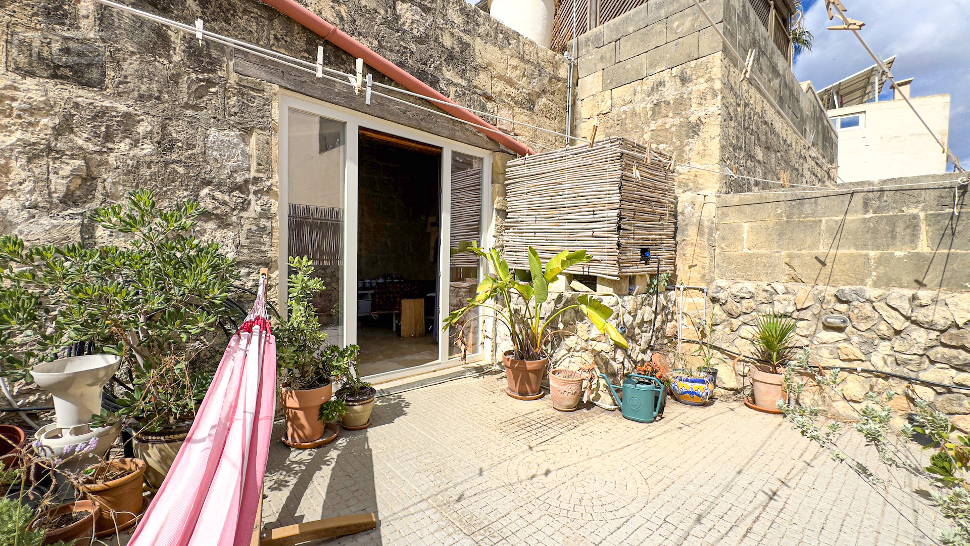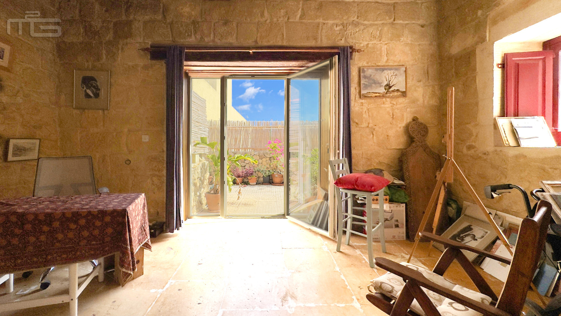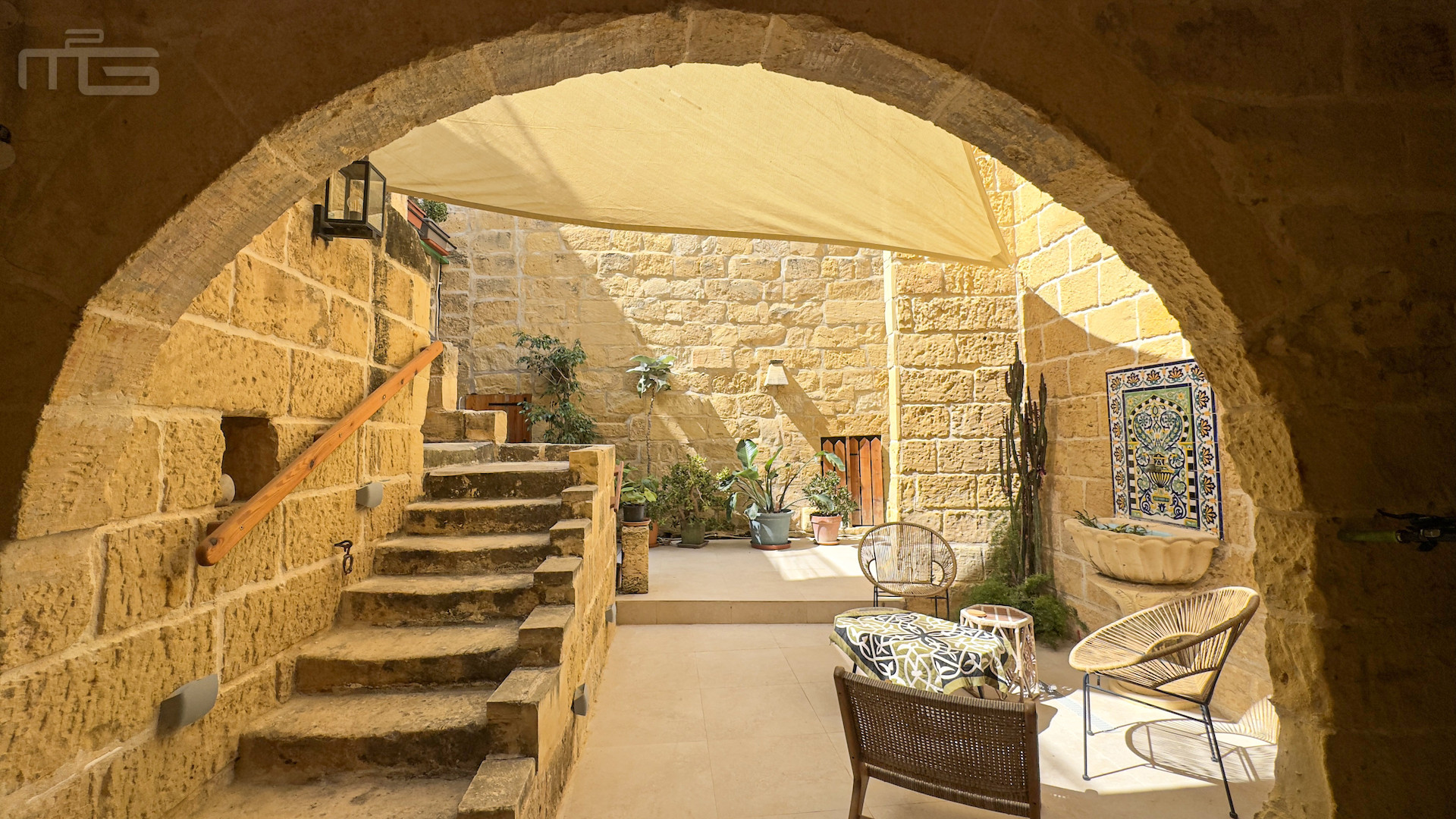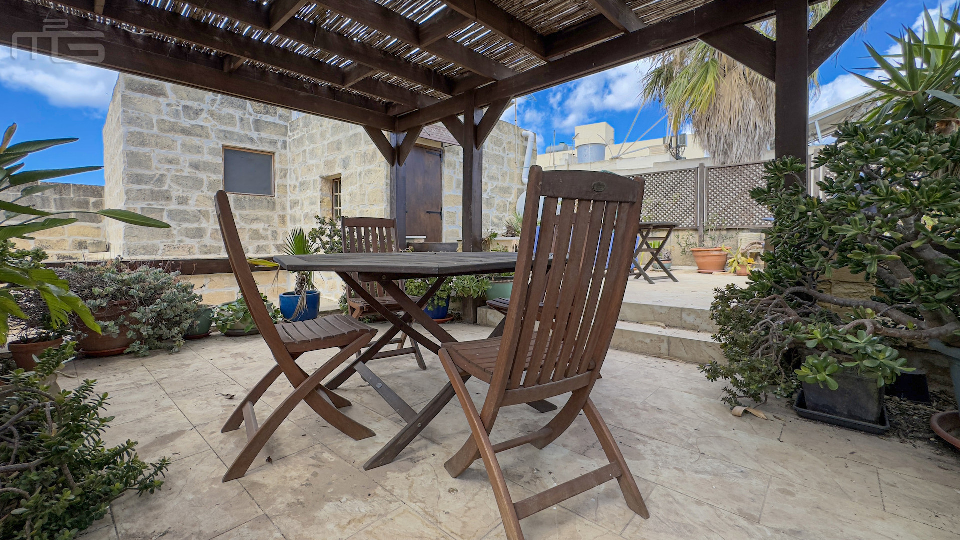 Upstairs, the accommodation continues with a spacious double or twin bedroom, a further double bedroom with traditional kileb and xorok ceilings, a feature which indicates the true age of this property, and which features an unusually long set of high level stone shelving. Opposite this room is a family bathroom. Across a charming terrace is the master bedroom with high beamed ceilings, stone floors, and its own ensuite. A further internal stone staircase ascends to a final bedroom, currently arranged as a bright office with its own terrace. At roof level, a lush 40 square meter roof garden creates a private oasis, perfect for sunbathing or just reading a book, with a wooden gazebo providing shade for outdoor dining and space to enjoy sunset drinks while taking in direct views of the Citadel at the heart of the island.