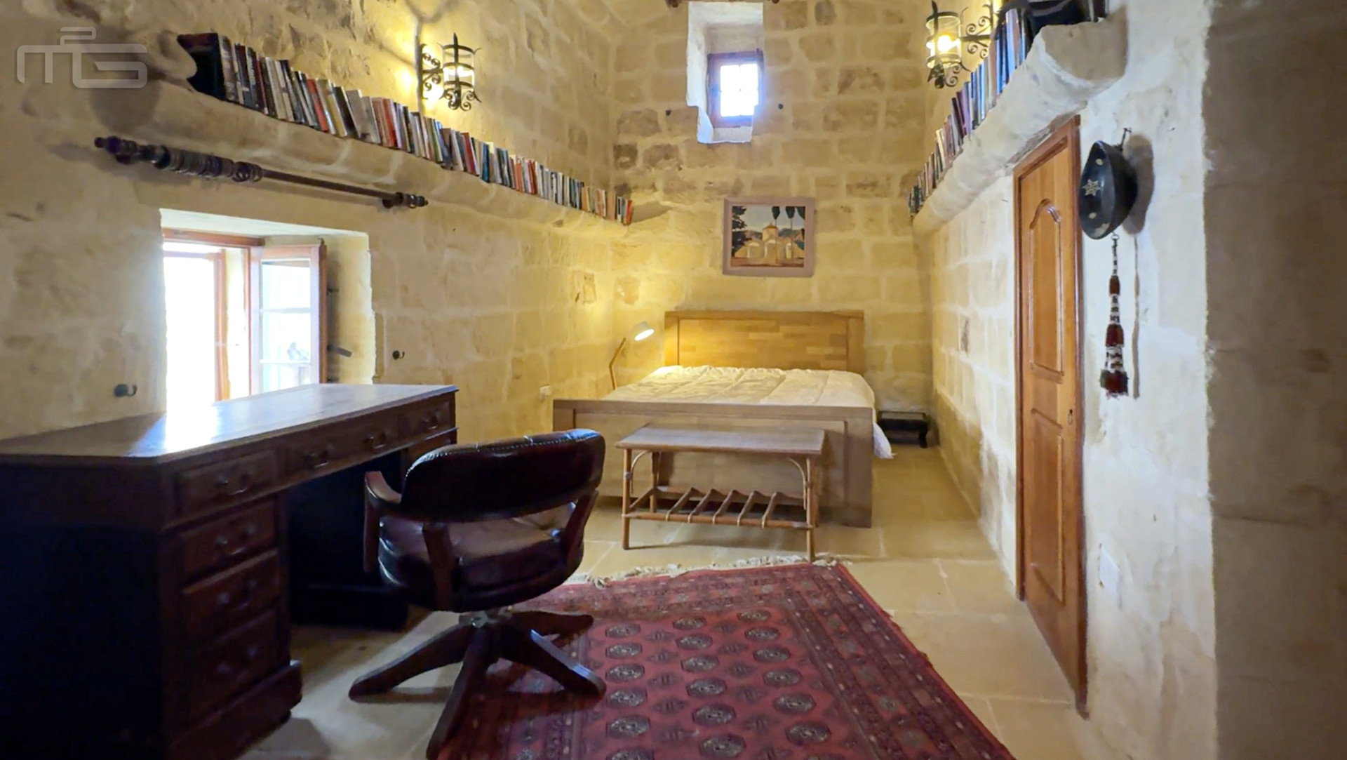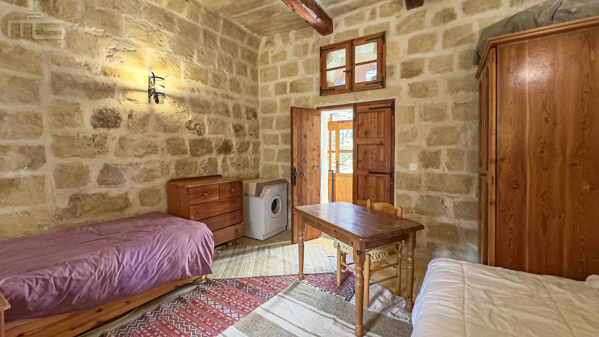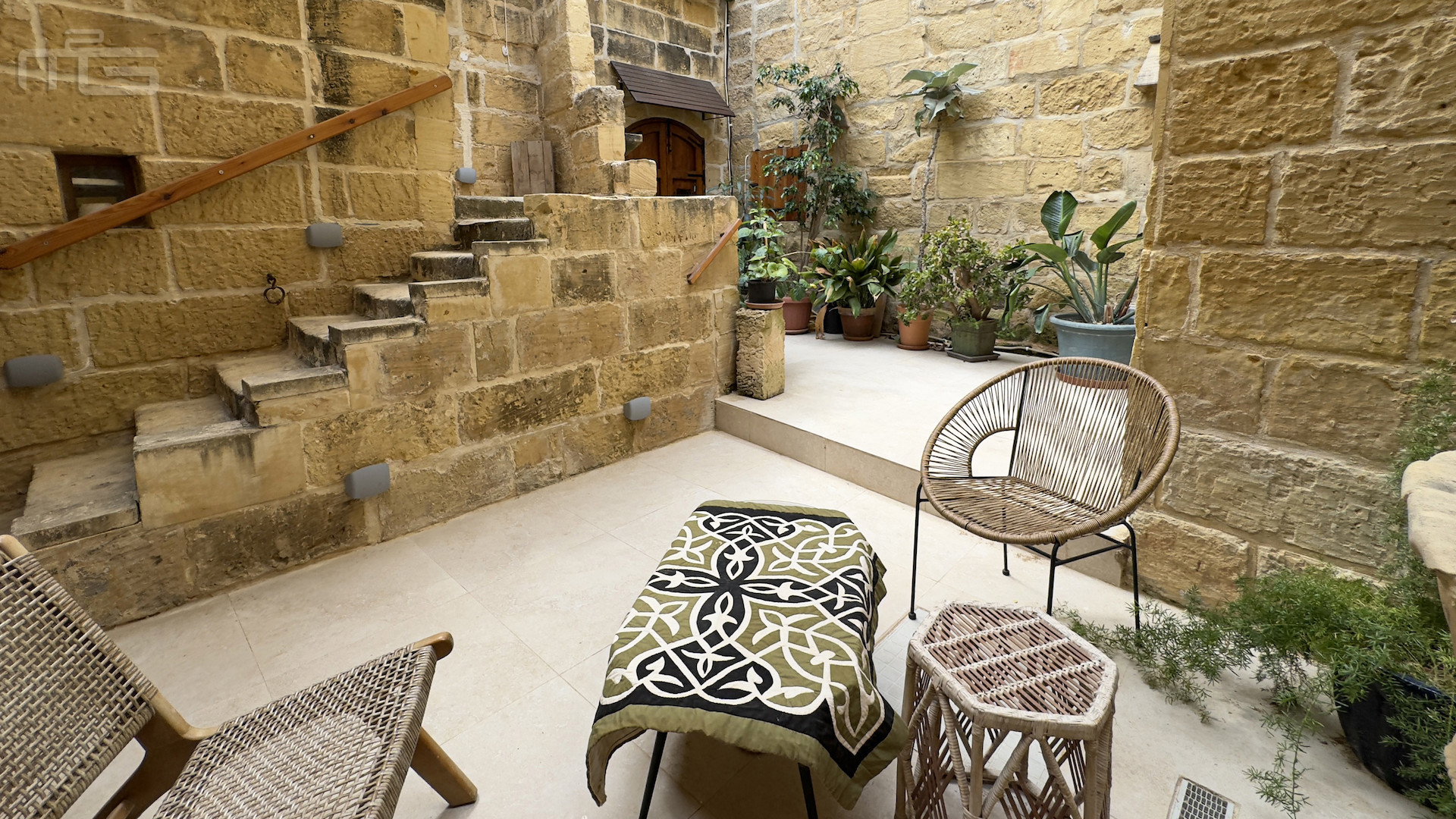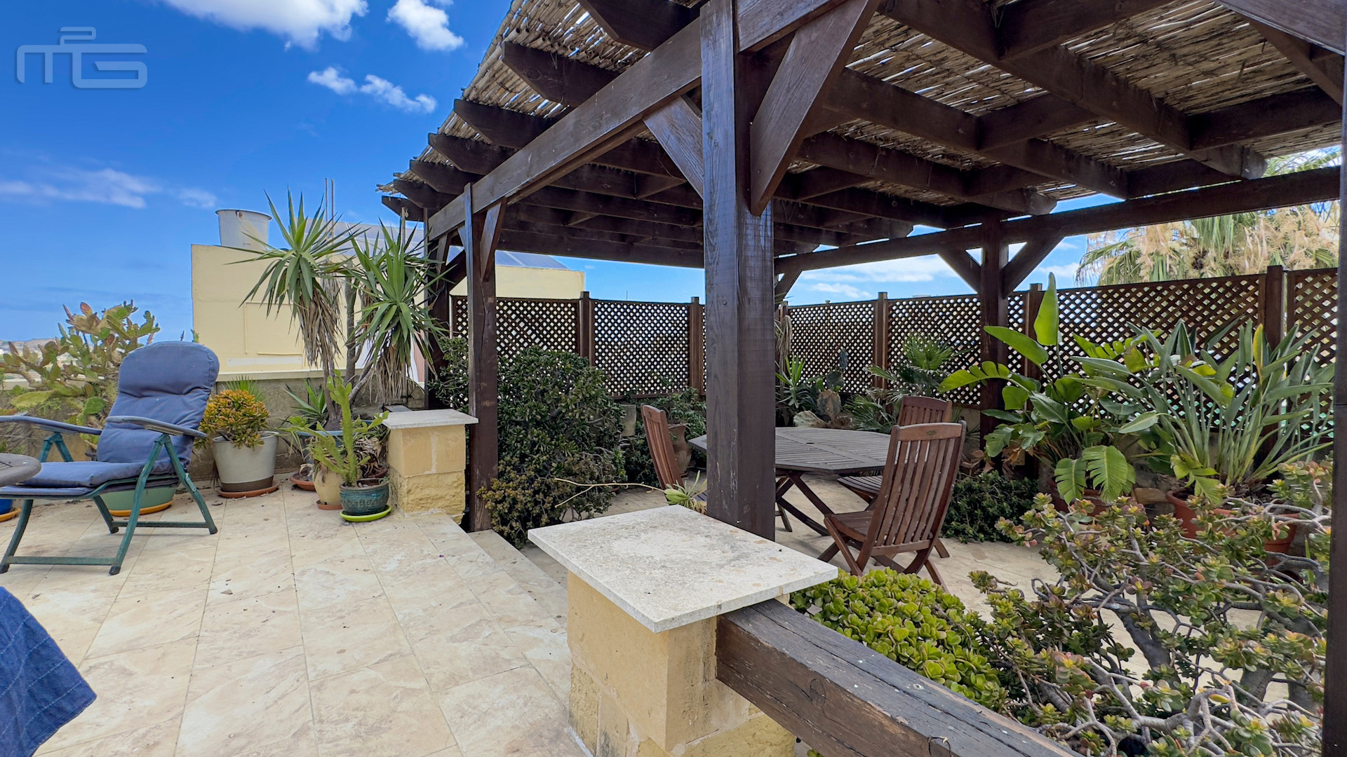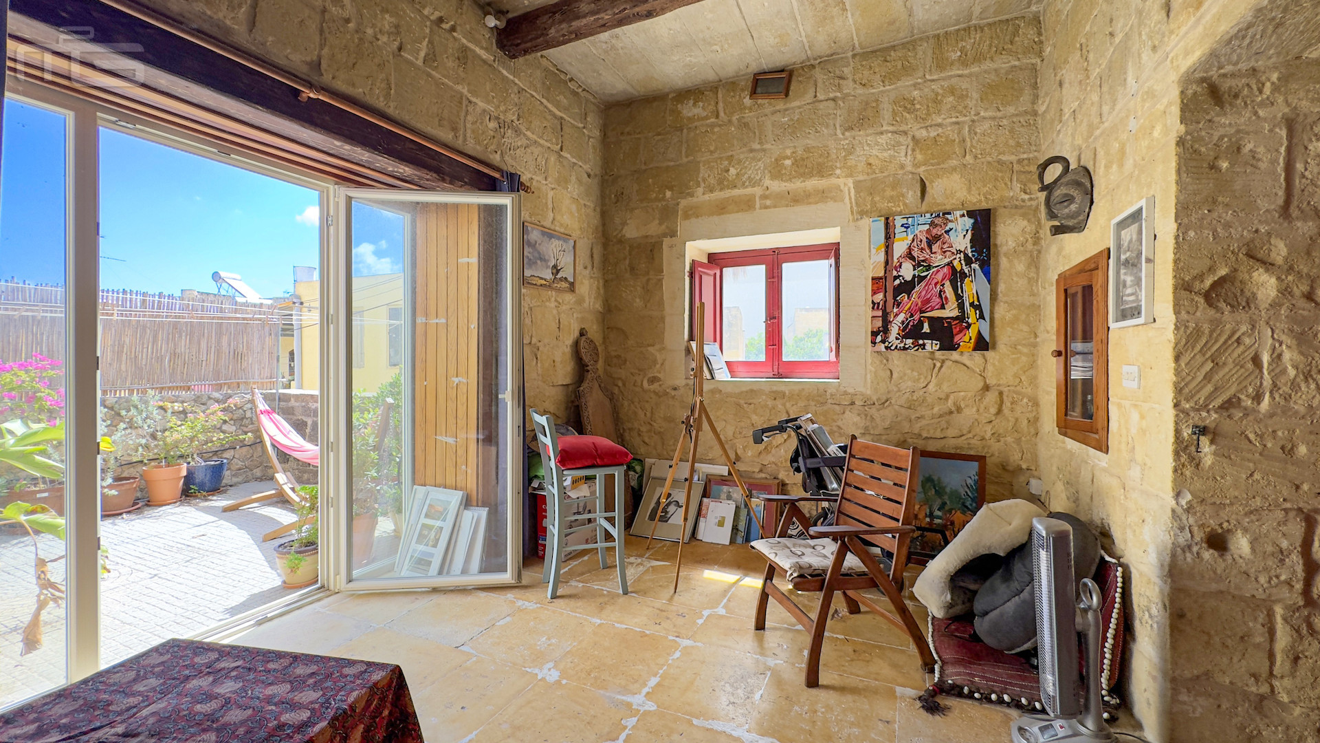 Upstairs, the accommodation continues with a spacious double or twin bedroom, a further double bedroom with traditional kileb and xorok ceilings, a feature which indicates the true age of this property, and which features an unusually long set of high level stone shelving. Opposite this room is a family bathroom. Across a charming terrace is the master bedroom with high beamed ceilings, stone floors, and its own ensuite. A further internal stone staircase ascends to a final bedroom, currently arranged as a bright office with its own terrace. At roof level, a lush 40 square meter roof garden creates a private oasis, perfect for sunbathing or just reading a book, with a wooden gazebo providing shade for outdoor dining and space to enjoy sunset drinks while taking in direct views of the Citadel at the heart of the island.