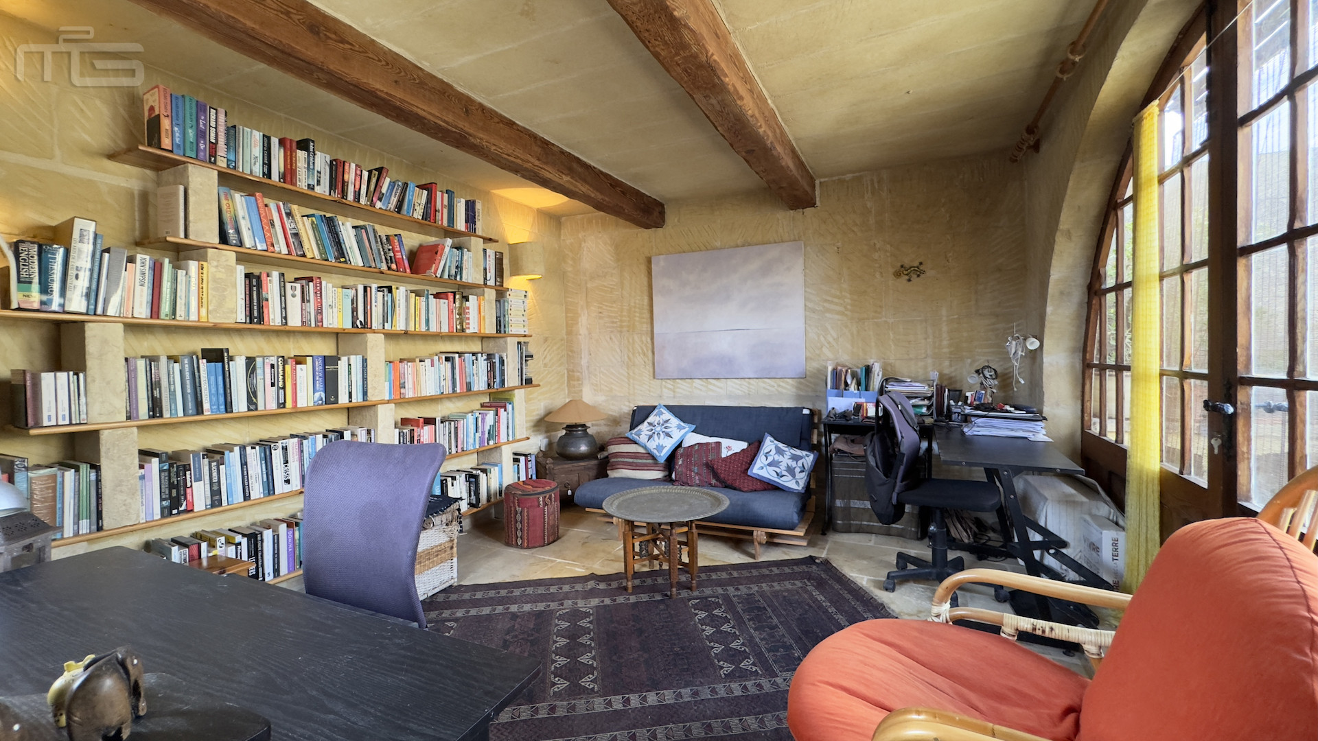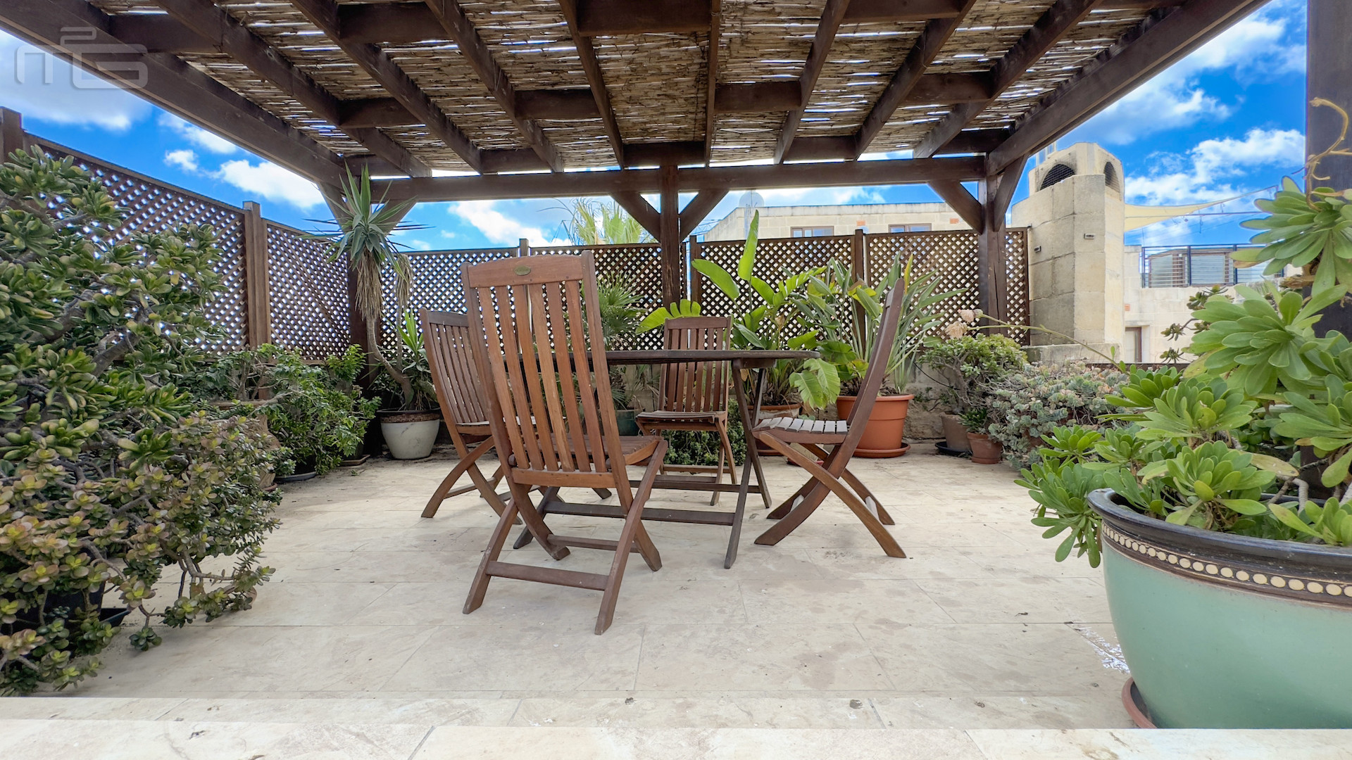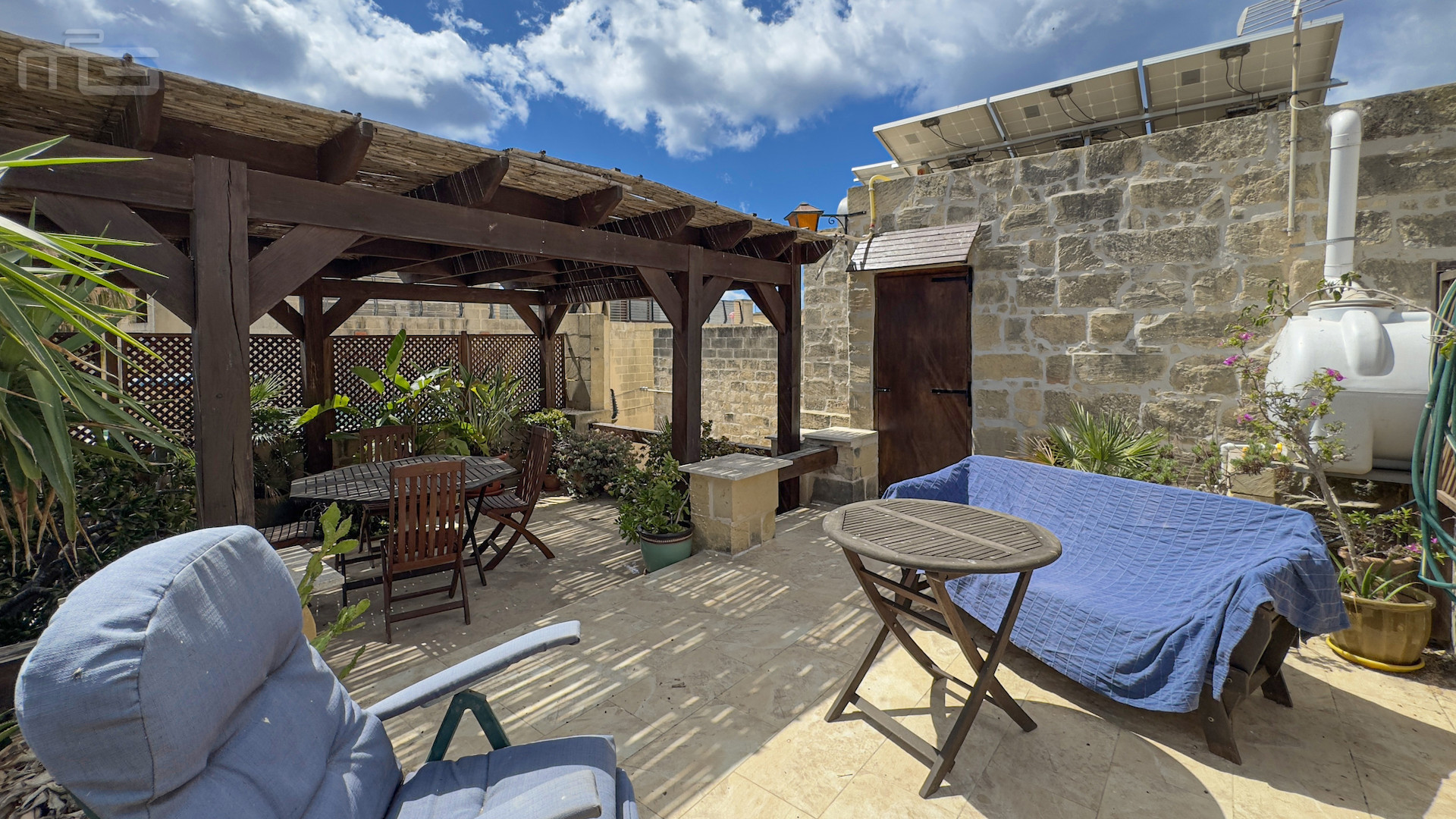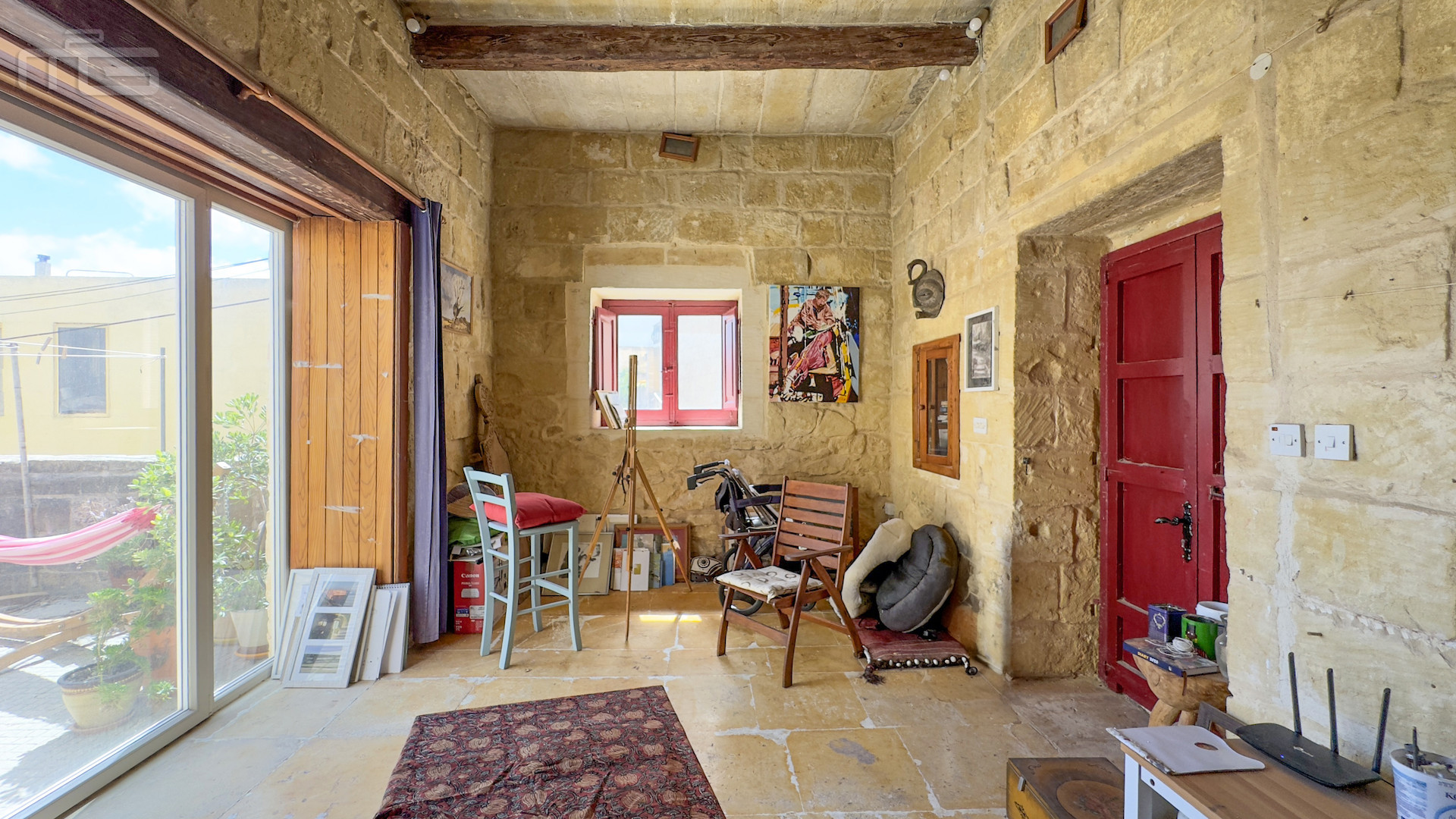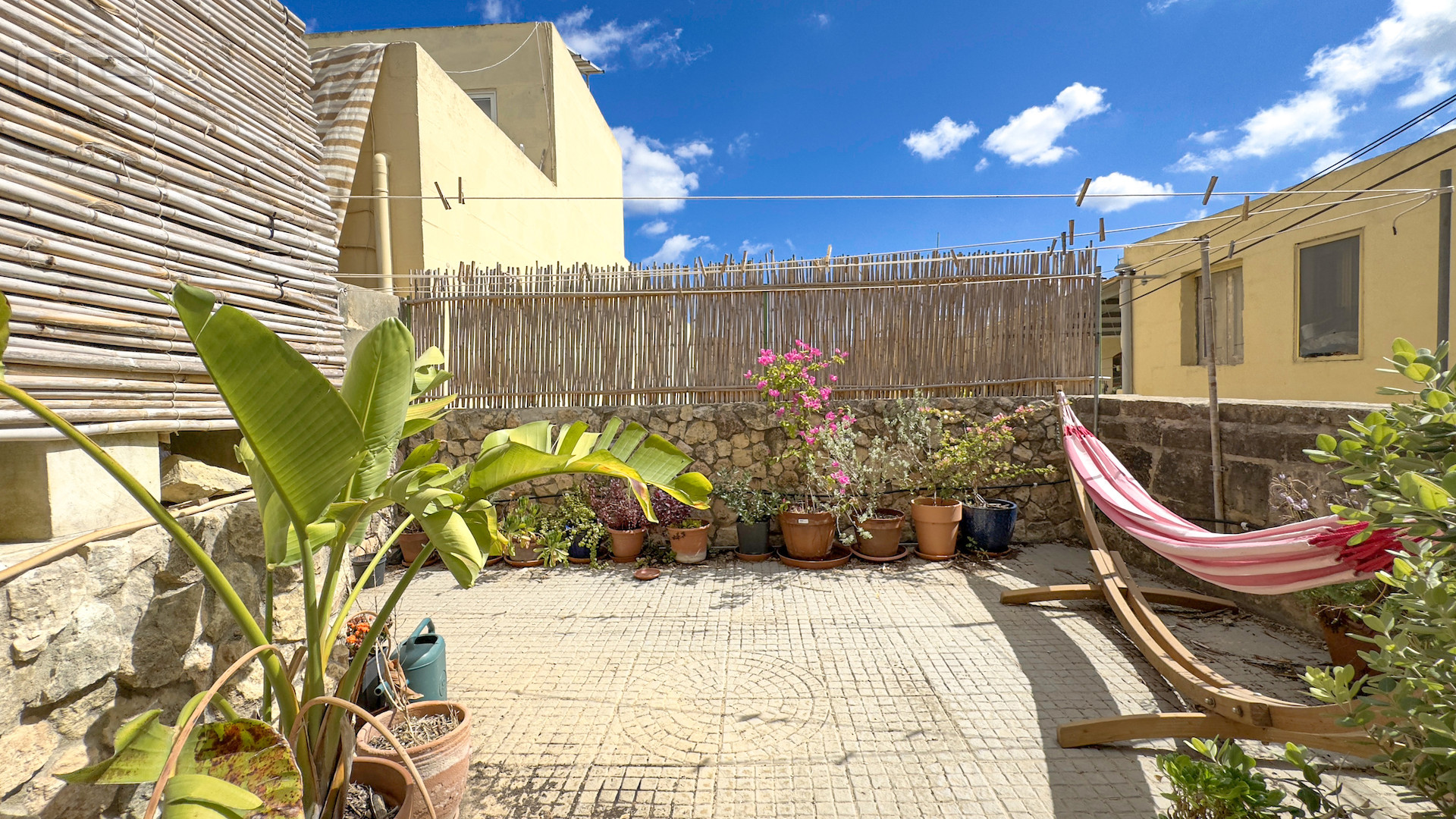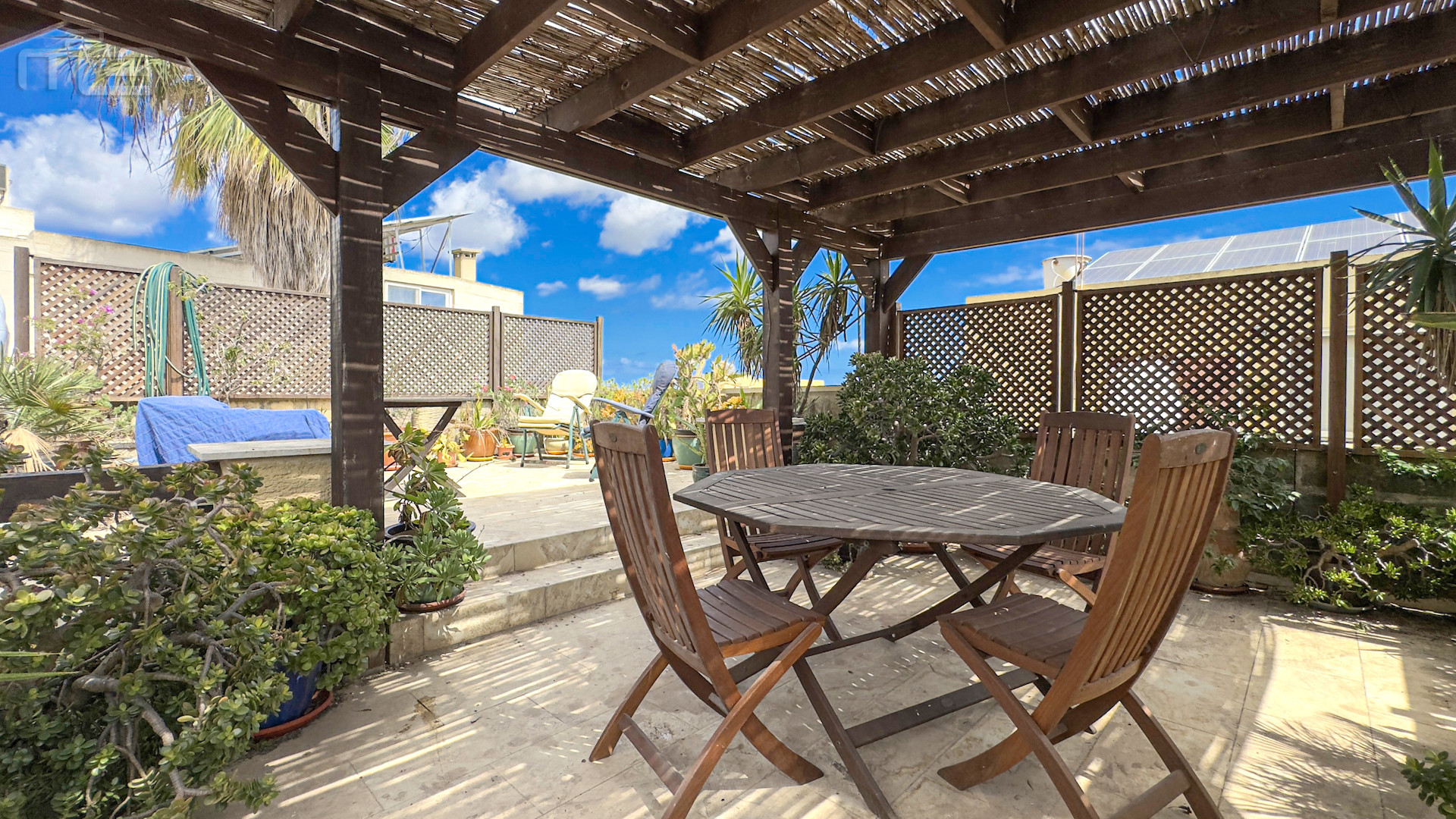 Upstairs, the accommodation continues with a spacious double or twin bedroom, a further double bedroom with traditional kileb and xorok ceilings, a feature which indicates the true age of this property, and which features an unusually long set of high level stone shelving. Opposite this room is a family bathroom. Across a charming terrace is the master bedroom with high beamed ceilings, stone floors, and its own ensuite. A further internal stone staircase ascends to a final bedroom, currently arranged as a bright office with its own terrace. At roof level, a lush 40 square meter roof garden creates a private oasis, perfect for sunbathing or just reading a book, with a wooden gazebo providing shade for outdoor dining and space to enjoy sunset drinks while taking in direct views of the Citadel at the heart of the island.
