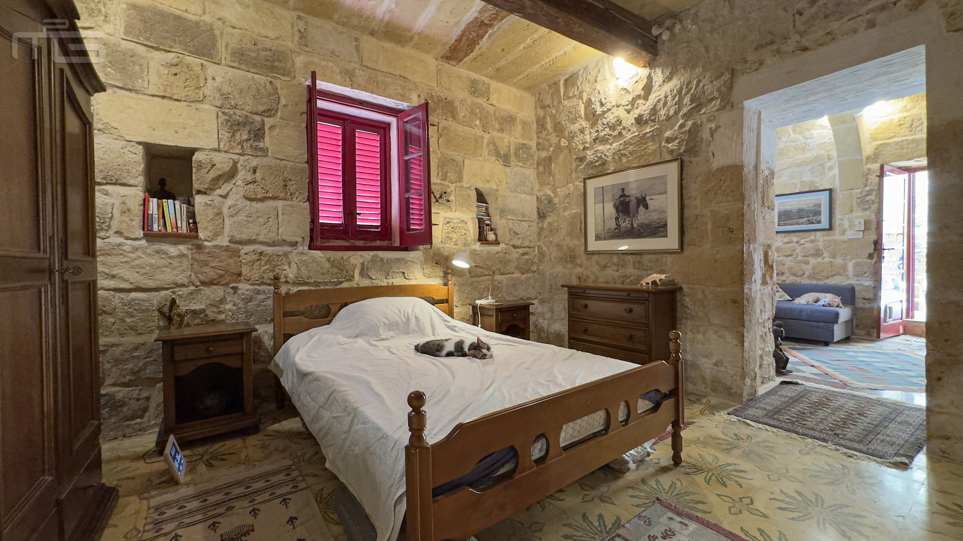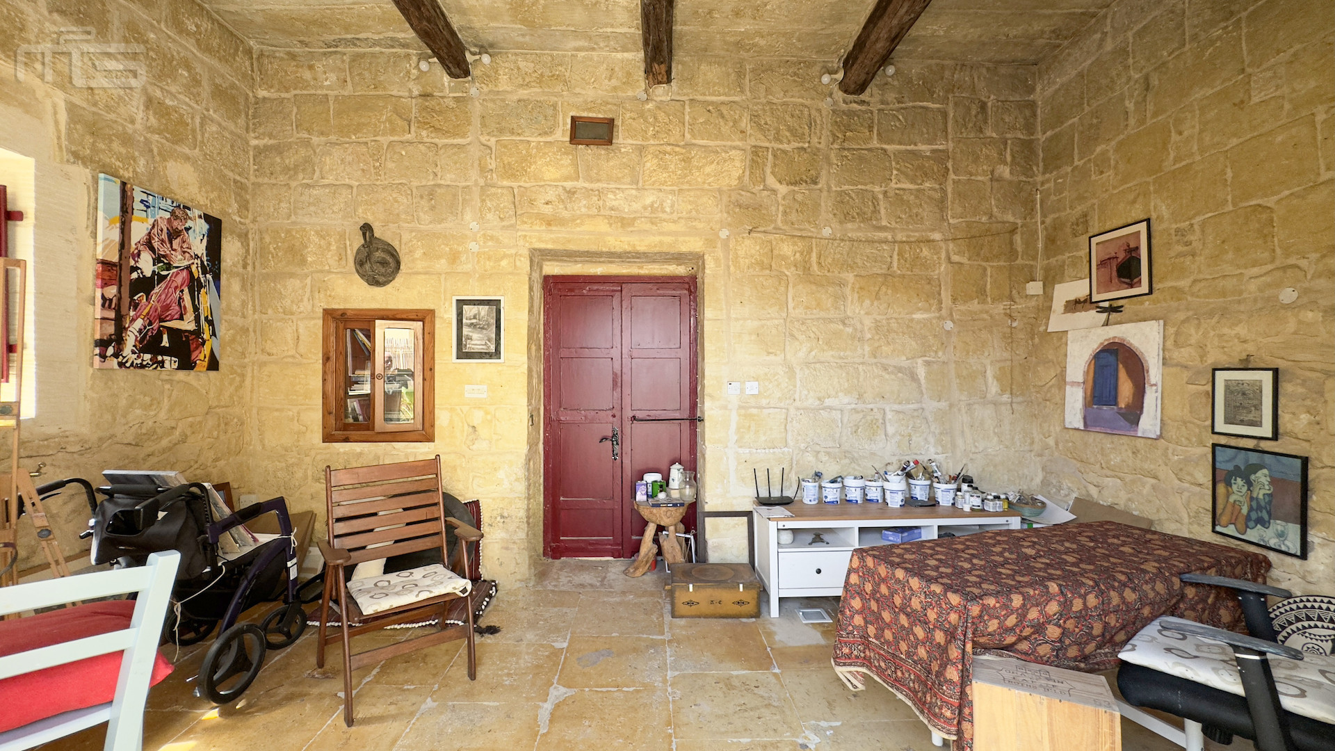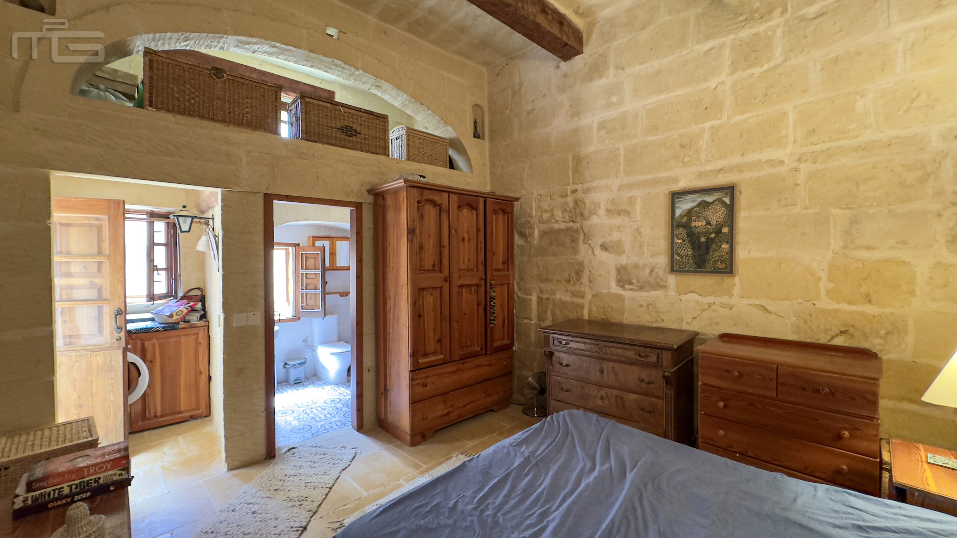 Accessed from the Courtyard, the smaller wing begins with a cosy living room, its hand-cut stone walls, stone arches, and a pellet fireplace creating charm, and warmth for all rooms. This leads to a spacious double bedroom with high stone ceilings, wooden beams, and a traditional tiled floor, complemented by a modern ensuite bathroom. An external traditional stone staircase rises to a large, light-filled bedroom currently used as an art studio, with high ceilings, stone slab floors, and a 20 square meter private terrace. An adjoining room at this level offers potential for conversion into a small shower room.