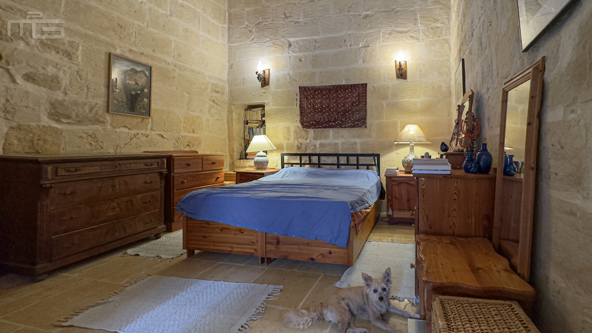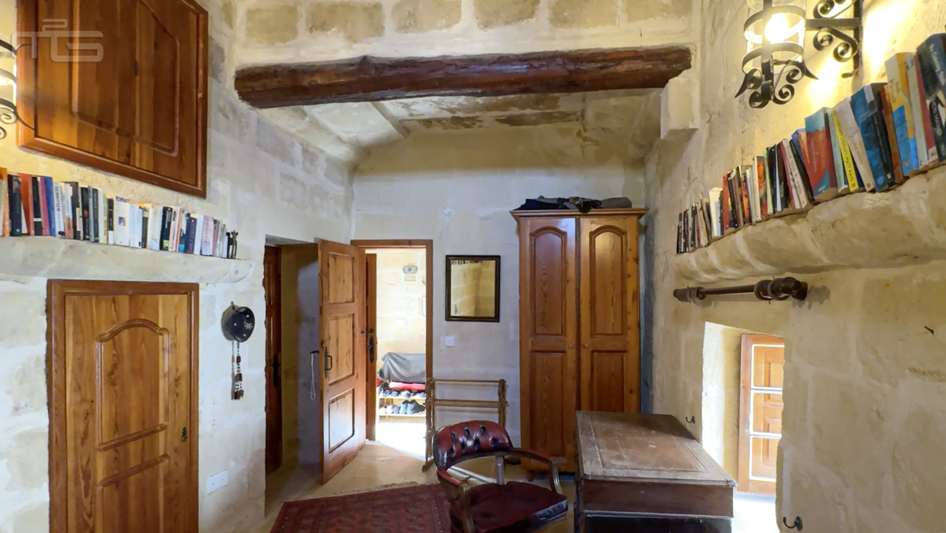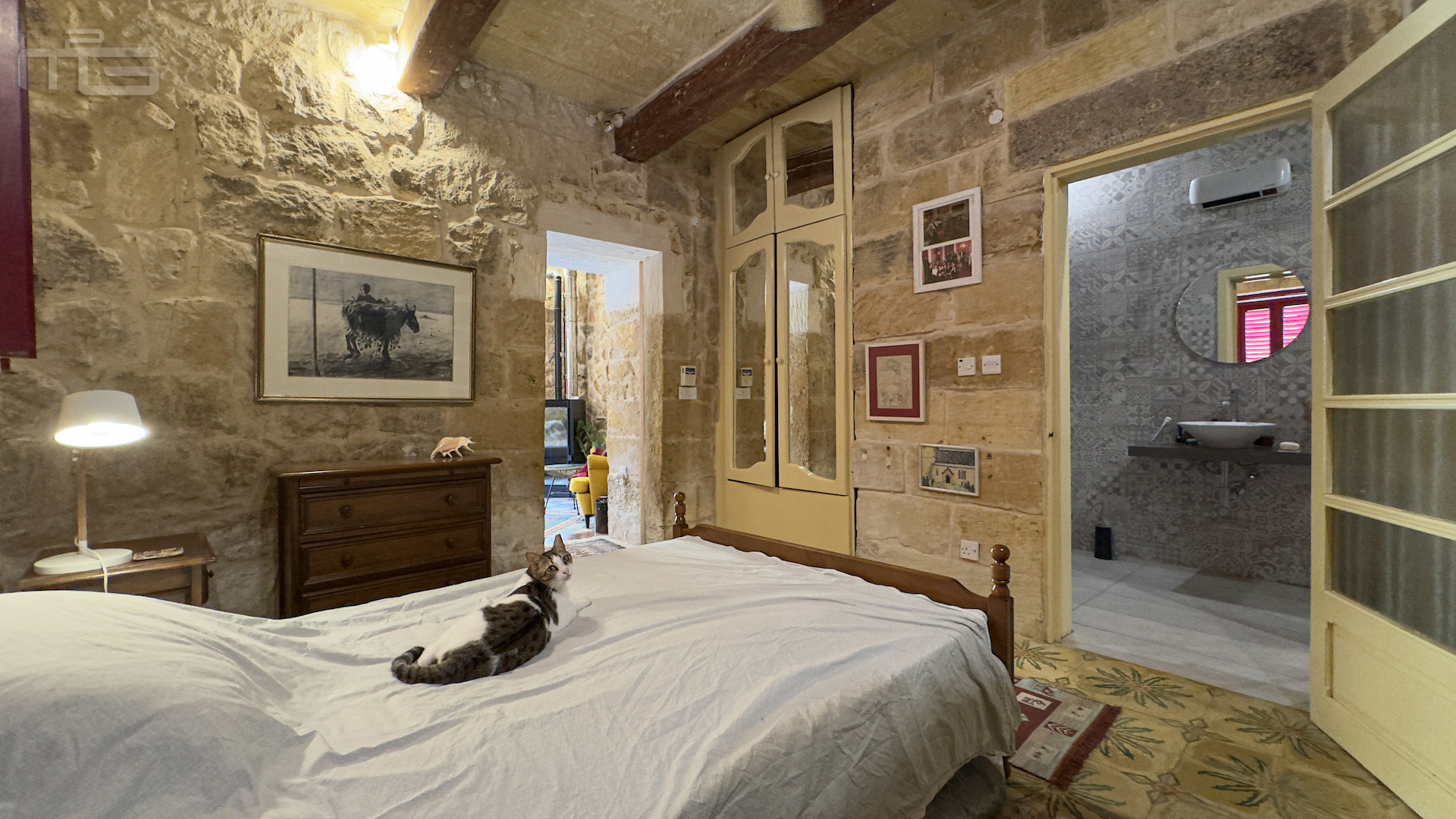 Accessed from the Courtyard, the smaller wing begins with a cosy living room, its hand-cut stone walls, stone arches, and a pellet fireplace creating charm, and warmth for all rooms. This leads to a spacious double bedroom with high stone ceilings, wooden beams, and a traditional tiled floor, complemented by a modern ensuite bathroom. An external traditional stone staircase rises to a large, light-filled bedroom currently used as an art studio, with high ceilings, stone slab floors, and a 20 square meter private terrace. An adjoining room at this level offers potential for conversion into a small shower room.