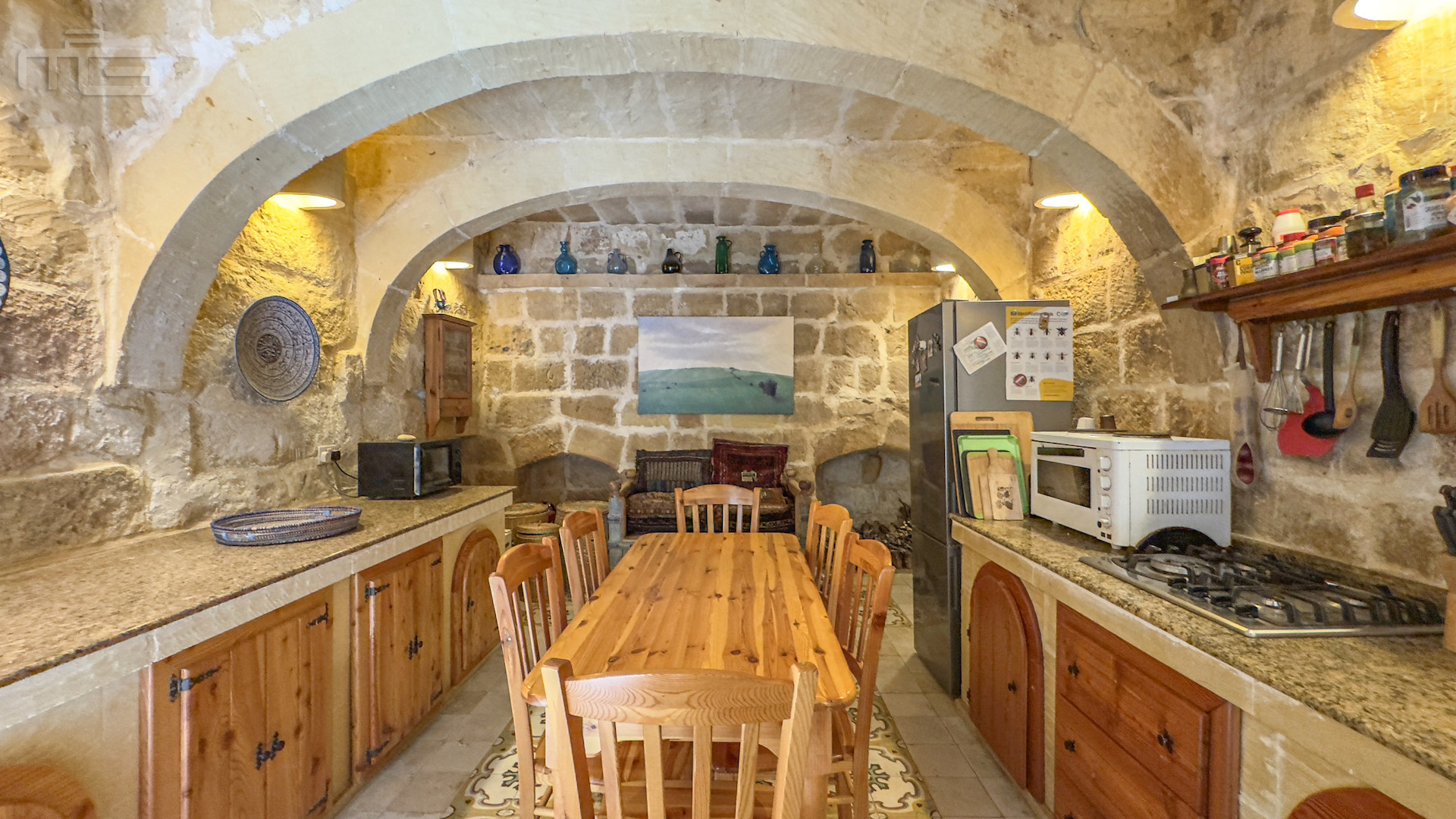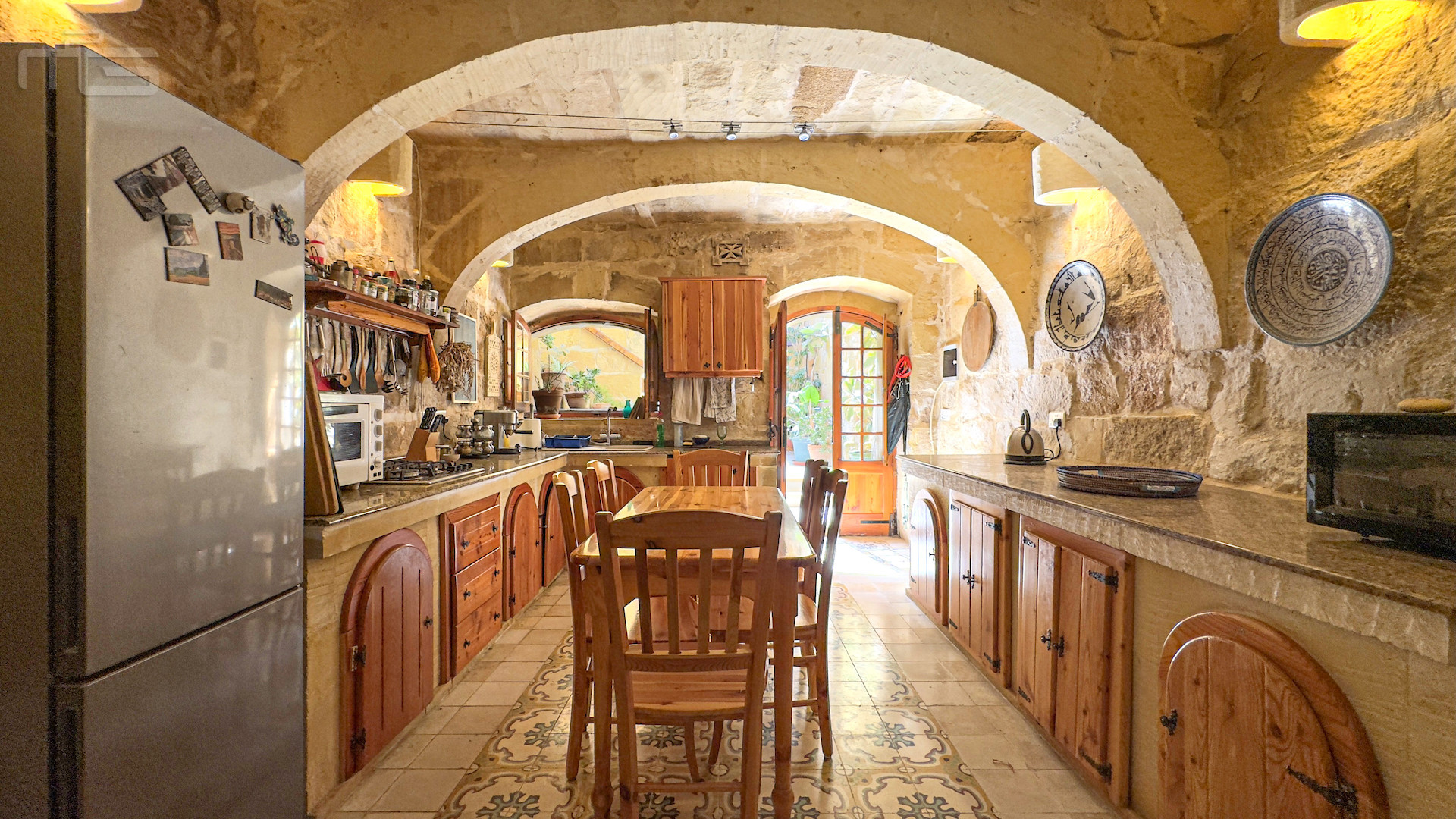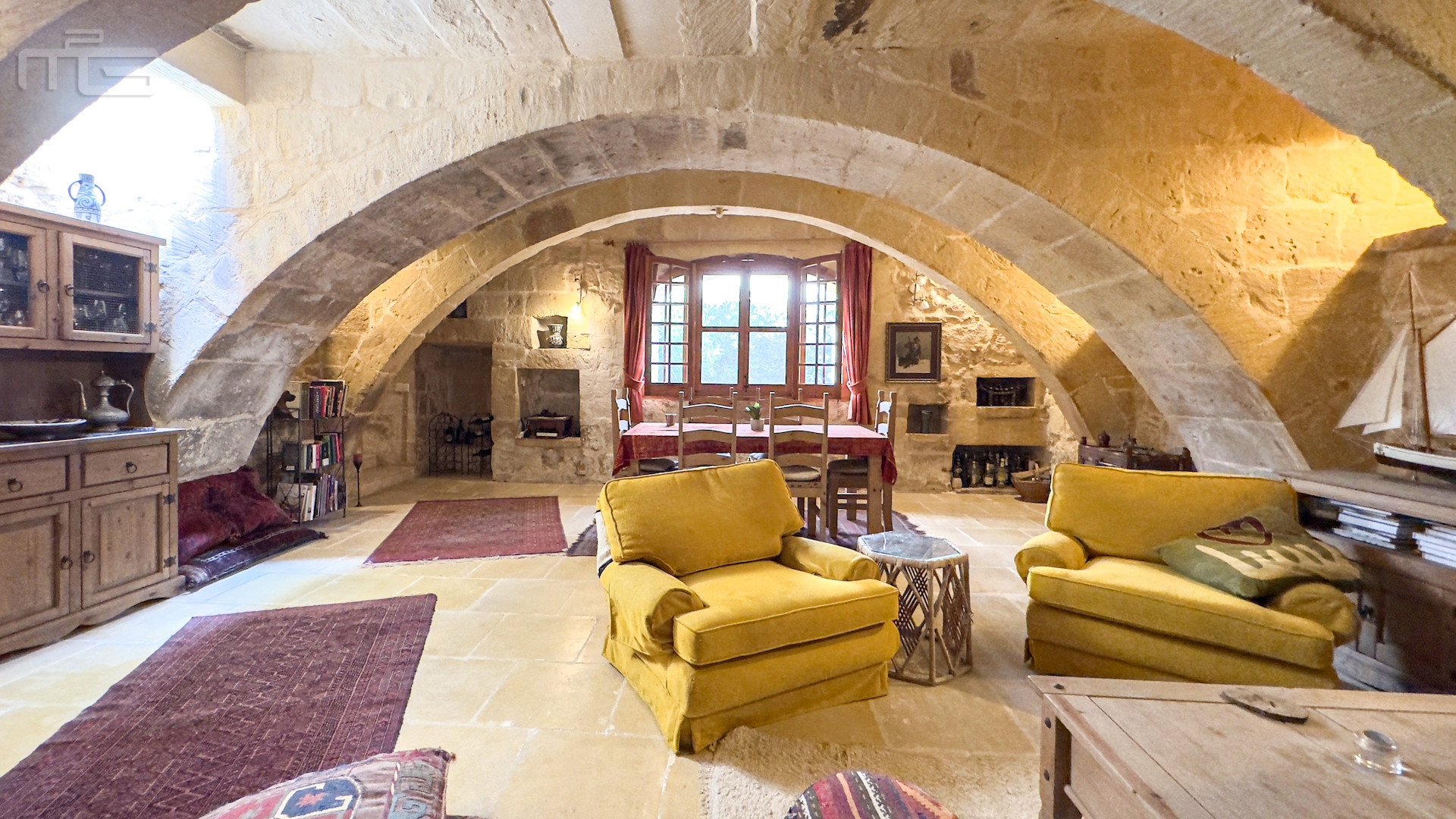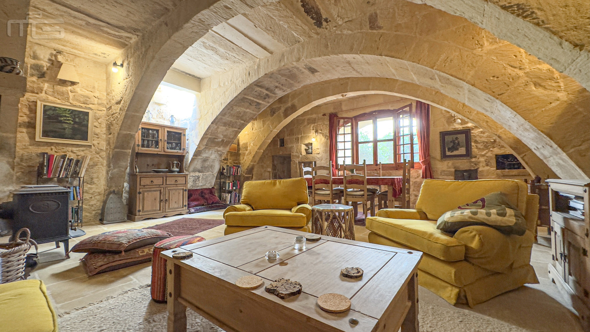 The main house is accessed from the courtyard through a rustic kitchen, full of character with its stone arches, patterned tiles, and original stone shelving. From here, one steps into the magnificent mill room, now the principal living space, where thick stone arches recall its history as a flour mill. With its naturally cool thick walls, this room is comfortable year-round and enhanced by a wood-burning stove, while a guest cloakroom is conveniently placed nearby. The mill room opens to a small 30 square meter private garden, adding yet another green retreat.