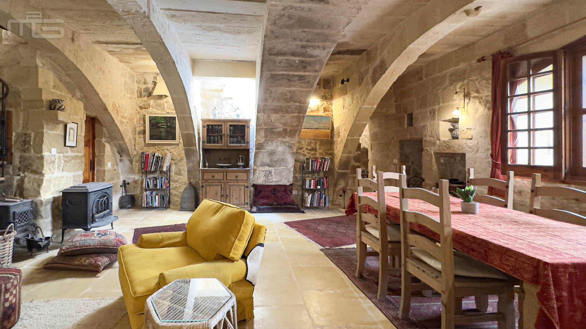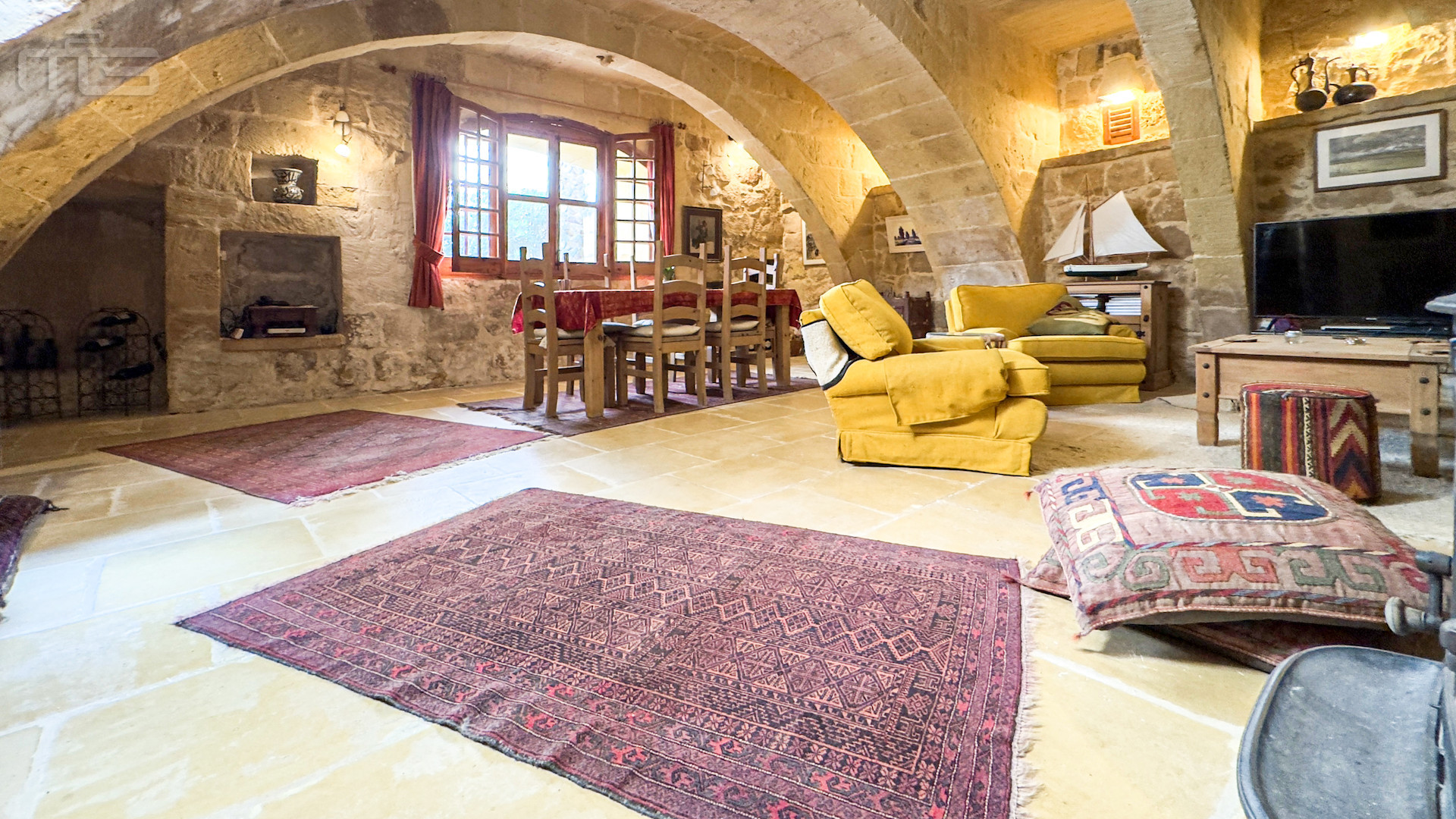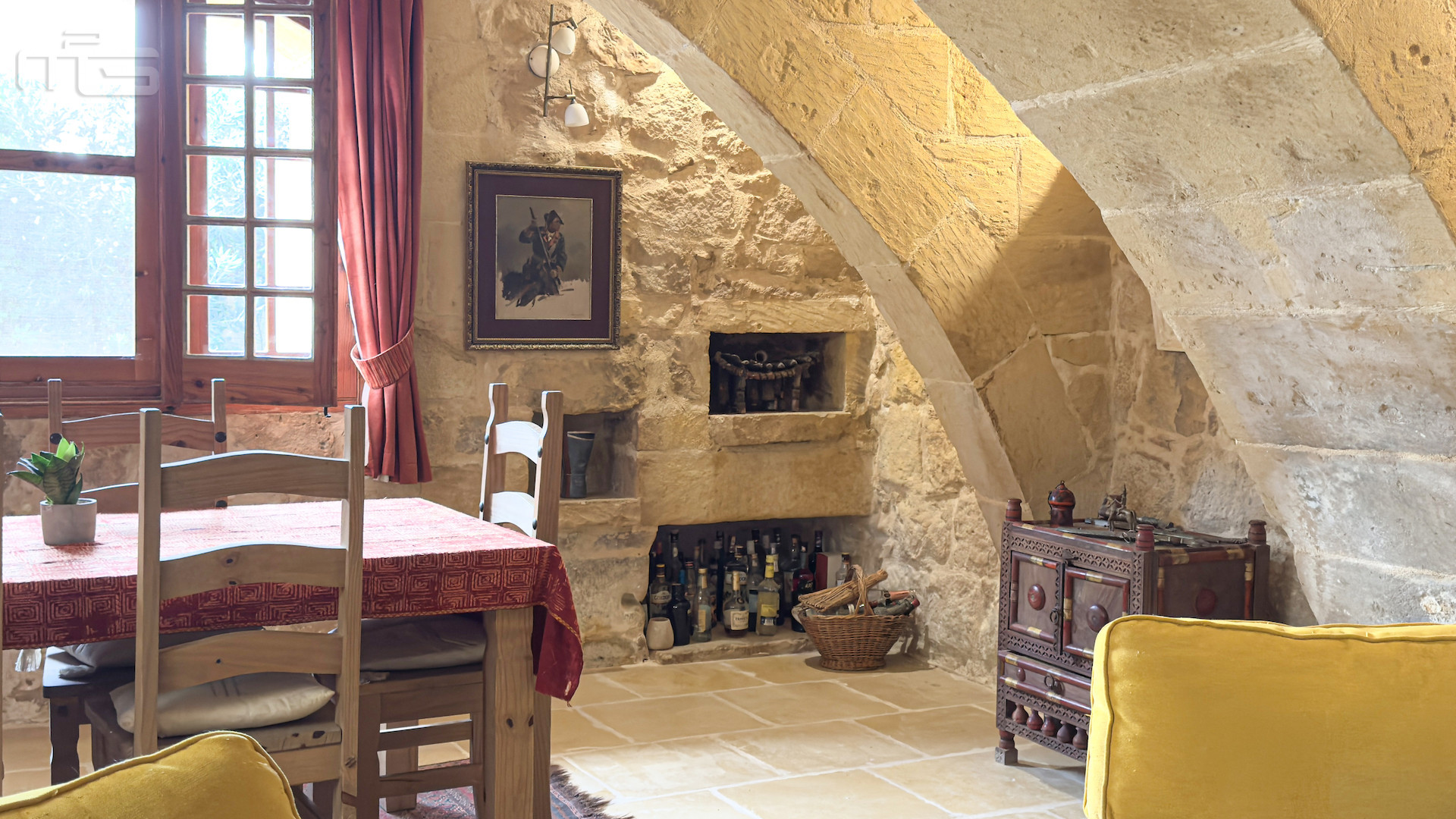 The main house is accessed from the courtyard through a rustic kitchen, full of character with its stone arches, patterned tiles, and original stone shelving. From here, one steps into the magnificent mill room, now the principal living space, where thick stone arches recall its history as a flour mill. With its naturally cool thick walls, this room is comfortable year-round and enhanced by a wood-burning stove, while a guest cloakroom is conveniently placed nearby. The mill room opens to a small 30 square meter private garden, adding yet another green retreat.