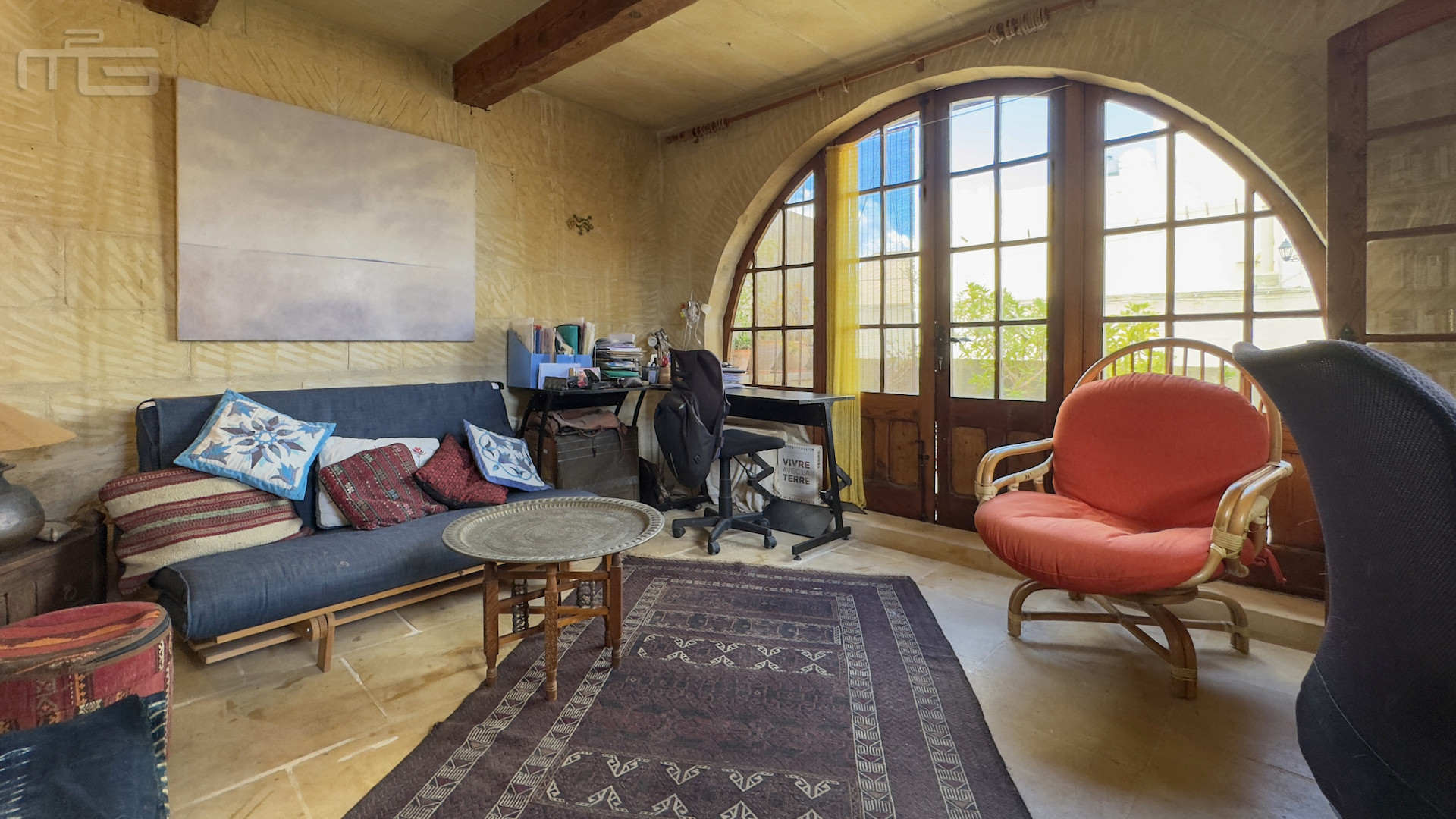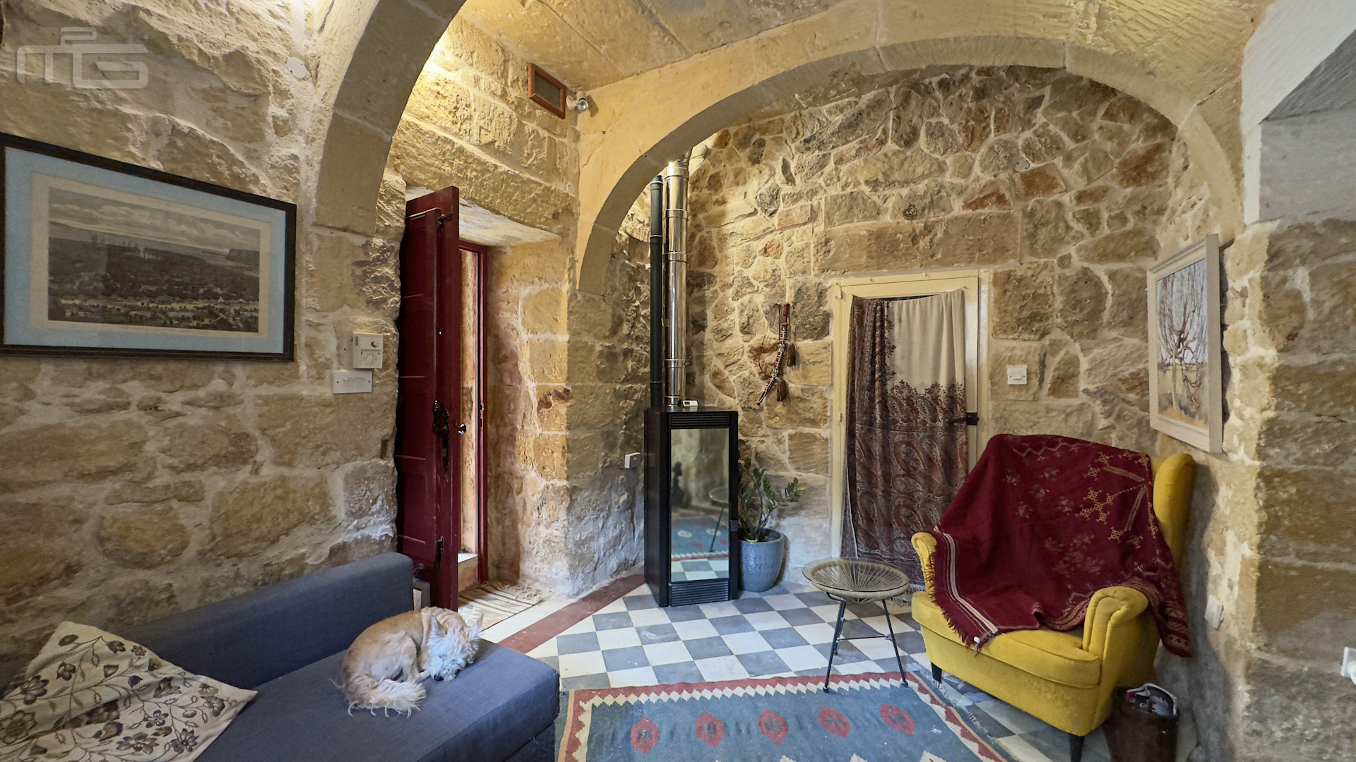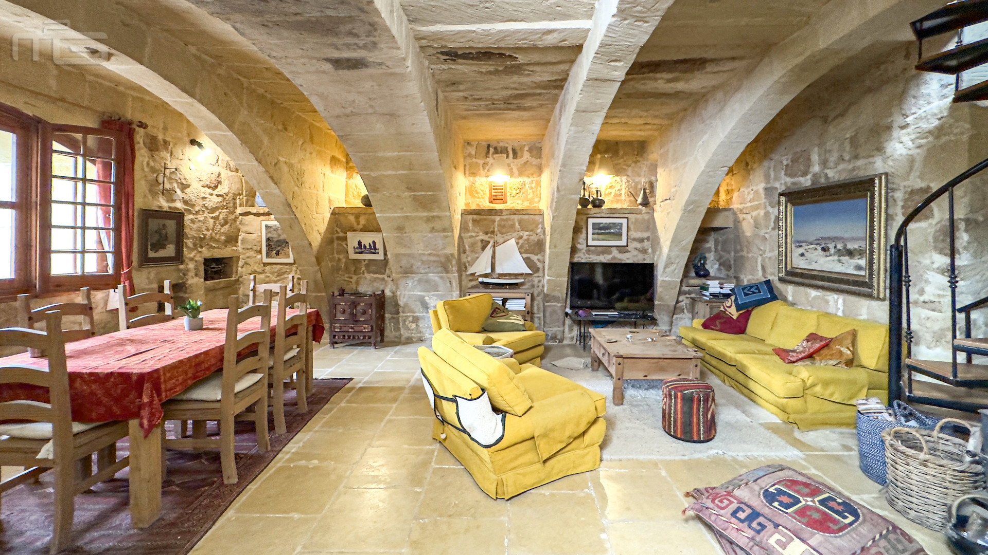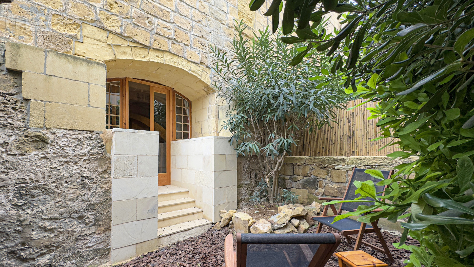 The main house is accessed from the courtyard through a rustic kitchen, full of character with its stone arches, patterned tiles, and original stone shelving. From here, one steps into the magnificent mill room, now the principal living space, where thick stone arches recall its history as a flour mill. With its naturally cool thick walls, this room is comfortable year-round and enhanced by a wood-burning stove, while a guest cloakroom is conveniently placed nearby. The mill room opens to a small 30 square meter private garden, adding yet another green retreat.
